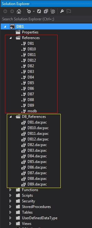 Next, I repeated my process of building the DB2 dacpac file for each of the other databases, and similarly imported and referenced all those dacpacs from DB1. I ended up with a DB1 project that had the following layout: