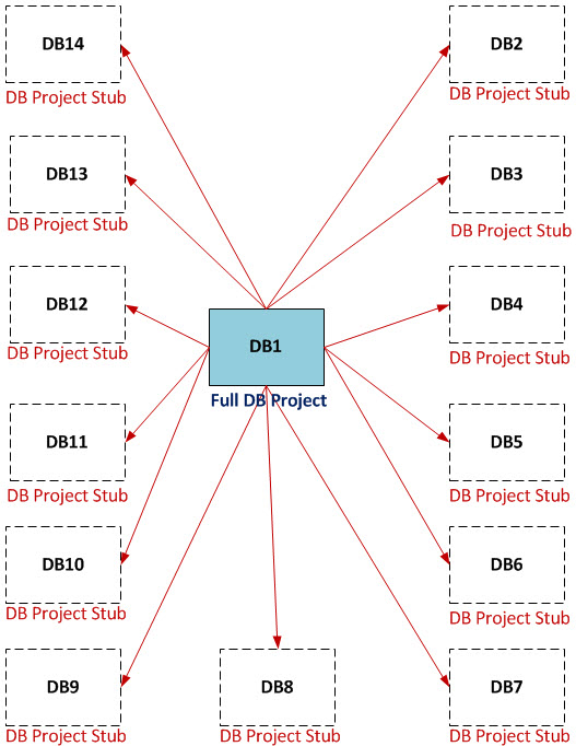 Note that the references are now only one-way, going from DB1 into other databases. There are no references from those other databases going anywhere else. The Solution Explorer looks like this: