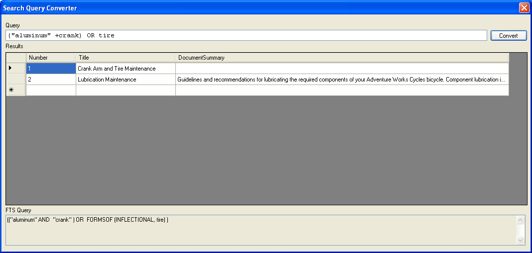 The @ftsQuery parameter is your actual CONTAINS clause FTS query with all of its strange and wondrous keywords and operators. In order to provide transparency to the conversion process, and make it easier to test, the sample application in the download displays the FTS query that your Google-syntax query generates, as shown below.