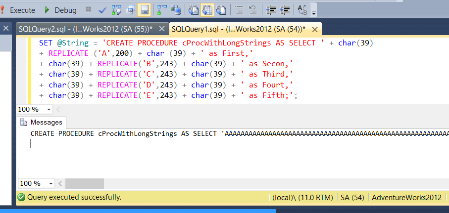 Run the procedure and test it to see if we have fixed the problem. It should work now. Let us now rerun our cProcWithLongStrings this new version of sp_helptext.