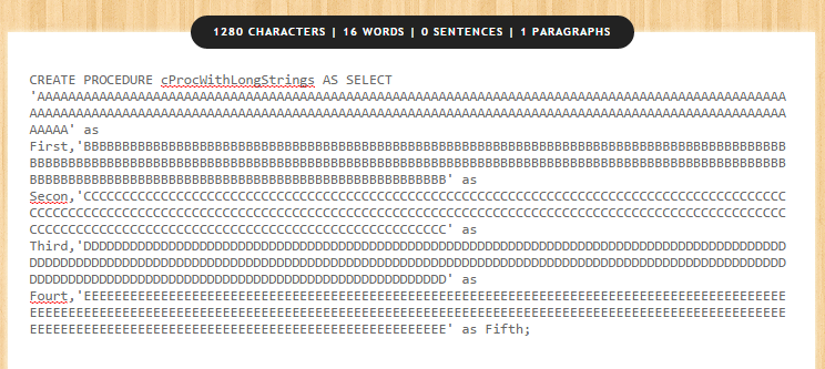 CREATE PROCEDURE cProcWithLongStrings AS SELECT 'AAAAAAAAAAAAAAAAAAAAAAAAAAAAAAAAAAAAAAAAAAAAAAAAAAAAAAAAAAAAAAAAAAAAAAAAAAAAAAAAAAAAAAAAAAAAAAAAAAAAAAAAAAAAAAAAAAAAAAAAAAAAAAAAAAAAAAAAAAAAAAAAAAAAAAAAAAAAAAAAAAAAAAAAAAAAAAAAAAAAAAAAAAAAAAAAAAAAAAAA' as First , 'BBBBBBBBBBBBBBBBBBBBBBBBBBBBBBBBBBBBBBBBBBBBBBBBBBBBBBBBBBBBBBBBBBBBBBBBBBBBBBBBBBBBBBBBBBBBBBBBBBBBBBBBBBBBBBBBBBBBBBBBBBBBBBBBBBBBBBBBBBBBBBBBBBBBBBBBBBBBBBBBBBBBBBBBBBBBBBBBBBBBBBBBBBBBBBBBBBBBBBBBBBBBBBBBBBBBBBBBBBBBBBBBBBBBBBBBBBBBBBBBBBB' as Secon , 'CCCCCCCCCCCCCCCCCCCCCCCCCCCCCCCCCCCCCCCCCCCCCCCCCCCCCCCCCCCCCCCCCCCCCCCCCCCCCCCCCCCCCCCCCCCCCCCCCCCCCCCCCCCCCCCCCCCCCCCCCCCCCCCCCCCCCCCCCCCCCCCCCCCCCCCCCCCCCCCCCCCCCCCCCCCCCCCCCCCCCCCCCCCCCCCCCCCCCCCCCCCCCCCCCCCCCCCCCCCCCCCCCCCCCCCCCCCCCCCCCCC' as Third , 'DDDDDDDDDDDDDDDDDDDDDDDDDDDDDDDDDDDDDDDDDDDDDDDDDDDDDDDDDDDDDDDDDDDDDDDDDDDDDDDDDDDDDDDDDDDDDDDDDDDDDDDDDDDDDDDDDDDDDDDDDDDDDDDDDDDDDDDDDDDDDDDDDDDDDDDDDDDDDDDDDDDDDDDDDDDDDDDDDDDDDDDDDDDDDDDDDDDDDDDDDDDDDDDDDDDDDDDDDDDDDDDDDDDDDDDDDDDDDDDDDDD' as Fourth , 'EEEEEEEEEEEEEEEEEEEEEEEEEEEEEEEEEEEEEEEEEEEEEEEEEEEEEEEEEEEEEEEEEEEEEEEEEEEEEEEEEEEEEEEEEEEEEEEEEEEEEEEEEEEEEEEEEEEEEEEEEEEEEEEEEEEEEEEEEEEEEEEEEEEEEEEEEEEEEEEEEEEEEEEEEEEEEEEEEEEEEEEEEEEEEEEEEEEEEEEEEEEEEEEEEEEEEEEEEEEEEEEEEEEEEEEEEEEEEEEEEEE' as Fifth;