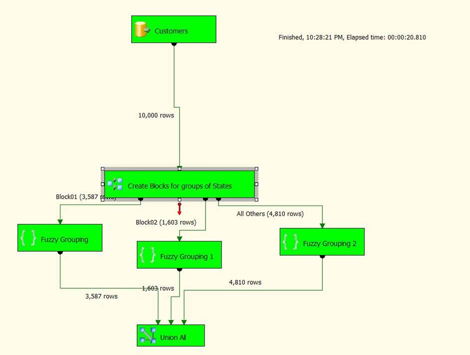 I then ran the same 10,000 records with a conditional split, creating a blocking index with three parallel threads by blocking on state. Using a blocking index, the execution time was 20 minutes.