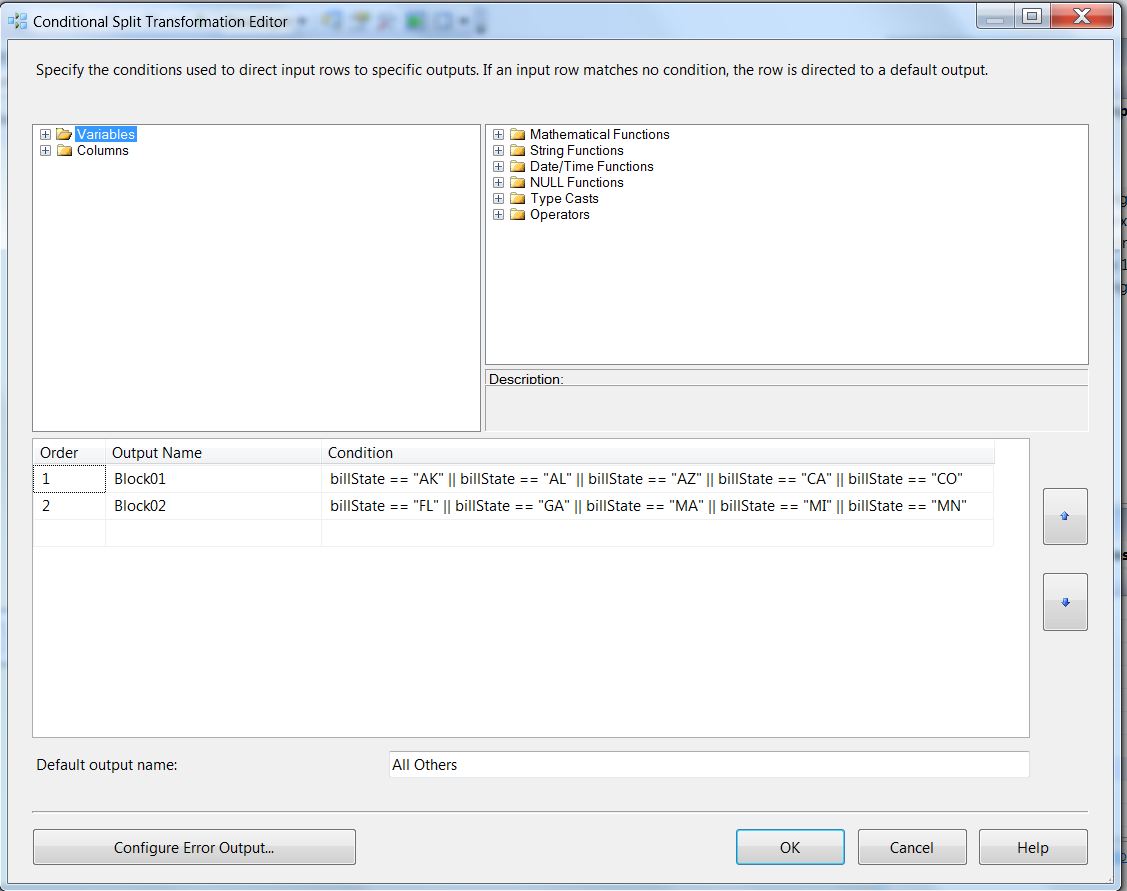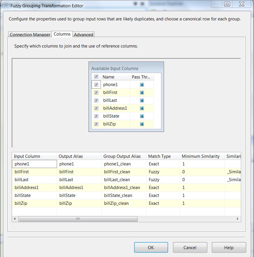 In the example below I will demonstrate Steps 2-5 using the SSIS Fuzzy Grouping and Conditional Split Components as well as the SSIS Pipeline Architecture for parallel processing. In SSIS the basic process for implementing blocking indexes involves using a Conditional Split to create multiple threads of records and applying the Fuzzy Grouping Transform. For this example we assume a basic customer input with: First Name, Last Name, Address, State, Zip, and Phone.