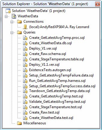 Our existing Database Solution is named WeatherData and it's a Database Project we created in SQL Server Management Studio. Once open, click View | Solution Explorer to display the solution artifacts: