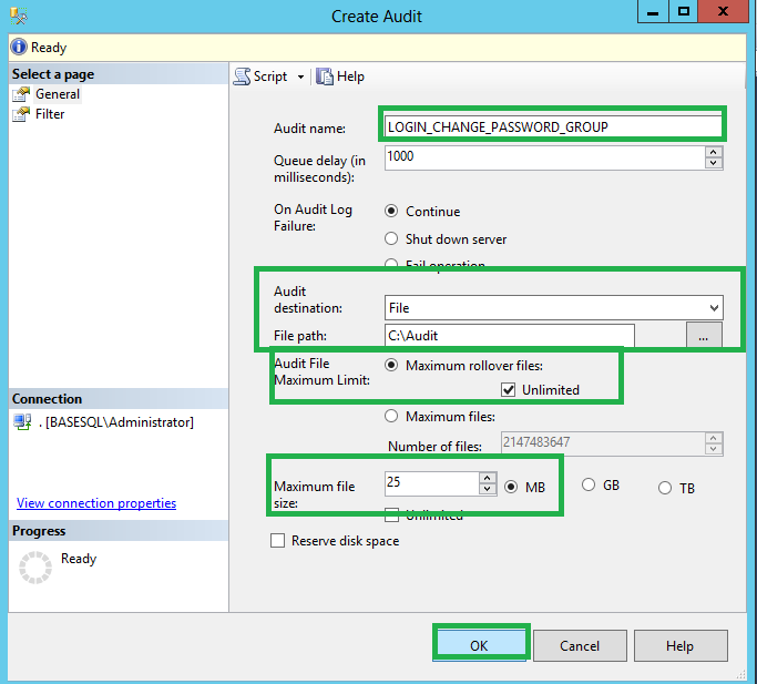 After creating the server audit, you need to create the server audit specification using these steps: