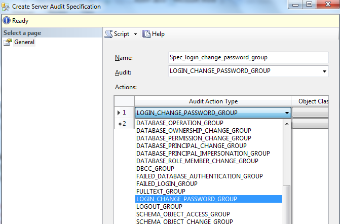 Specify the name of the Server Audit Apecification. This is generated automatically when you create a new Server Audit Specification but is editable. For example, the name ‘Spec_login_change_password_group’ is used in Fig. 4.