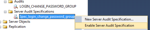 Navigate to Audits under the security folder in SSMS and right click on the Spec_login_change_password_group under server audit specification. Select Enable Server Audit Specification, as shown in Fig. 7.