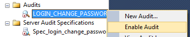 After setting up the server audit and server audit specification, you have to enable the audit. By default the audit is in a disabled state. To enable this, navigate to Audits under the security folder in SSMS and right click on the LOGIN_CHANGE_PASSWORD_GROUP under audits. Select Enable Audit, as shown in Fig. 6.