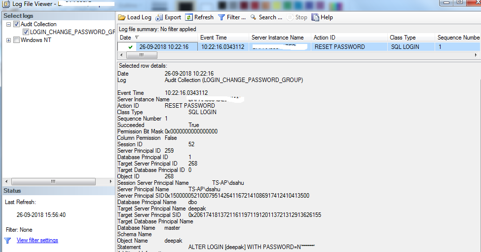 For example, I changed the password for the login, Deepak, and checked the audit log to see if it captured the password reset. Yes, it worked as shown in Fig. 9. In the below log file viewer, we can see who(TS-AP\dsahu) has changed the password, what action was taken (RESET PASSWORD), for which login (Deepak), and when the password was changed.