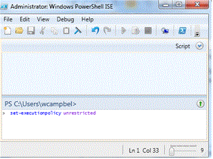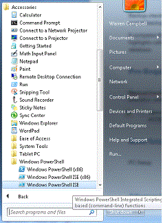 - Launch the Windows PowerShell Integrated Scripting Environment (Start> All Programs > Accessories > Windows PowerShell> Windows PowerShell ISE.