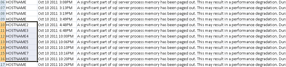 In the same script, I grab the past 72 hours of error logs from all of my servers, filter out some mundane entries and condense them into one Excel sheet for quick review. This is not quite as pretty as the html report, but it’s fast and the data is easy to work with (i.e filter) in Excel. The excel output ends up looking a lot like your error logs, but it's one stop shopping: