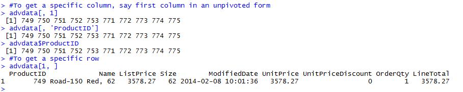 #To get a specific column, refer to the # of the column or name of the column advdata[1] advdata[‘ProductId’] #To get a specific column, say first column in an unpivoted form advdata[, 1] advdata[, ‘ProductID’] advdata$ProductID #To get a specific row advdata[1, ]