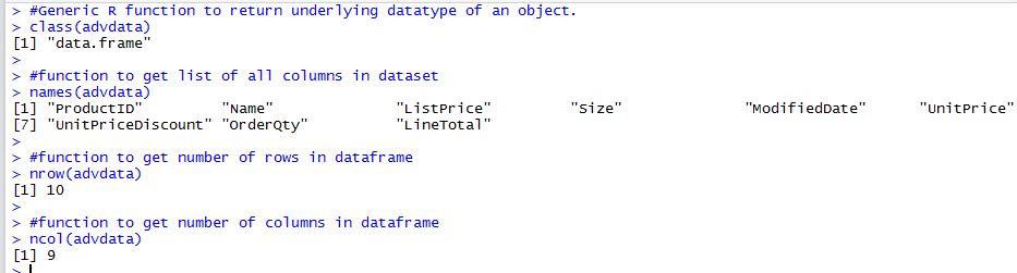 #Generic R function to return underlying datatype of an object. class(advdata) #function to get list of all columns in dataset names(advdata) #function to get number of rows in dataframe nrow(advdata) #function to get number of columns in dataframe ncol(advdata)