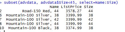 #Getting rows based on and condition subset(advdata, advdata$Size < 60 & advdata$ListPrice < 3500)