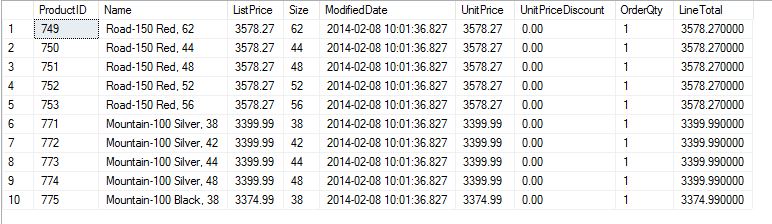 USE AdventureWorks2016CTP3 SELECT DISTINCT TOP 10 P.ProductID, P.Name, P.ListPrice, P.Size, P.ModifiedDate, SOD.UnitPrice, SOD.UnitPriceDiscount, SOD.OrderQty, SOD.LineTotal FROM Sales.SalesOrderDetail SOD INNER JOIN Production.Product P ON SOD.ProductID = P.ProductID WHERE SOD.UnitPrice > 1000 ORDER BY SOD.UnitPrice DESC