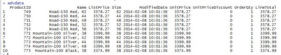 I am using the Adventureworks for 2016 database here. In the below commands, I am connecting to the database from R Studio and pulling the data I need into a dataset. The dataset I am using is a simple T-SQL query as below:
