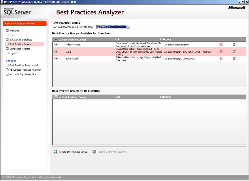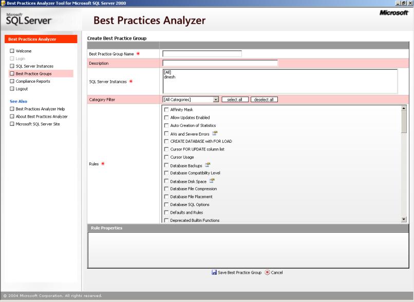 Above is the screen in which you create a best practices (BP) group. You can create BP for the all the servers which are registered on your PC. For one BP group, many rules can be selected from one or more categories. Just clicking the rule will take you to the description relevant to that rule.