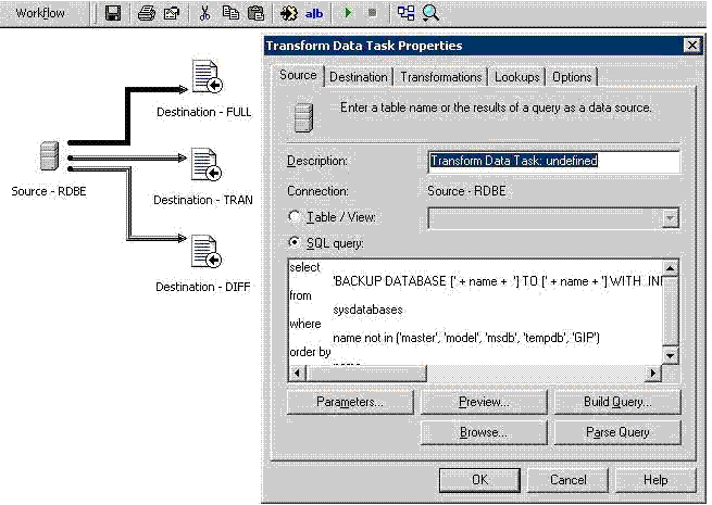 Inside each Transformation Data Task a script is added to generate the full, tansaction log and the differential backup.