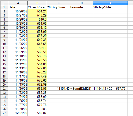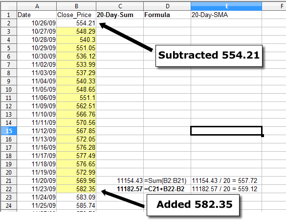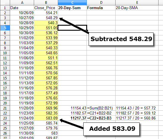 This shows the base case in which we have to do an initial summation of the close price in the first 20 rows. Remember for this solution, focus on the Sum, not on the average. The 20 day SUM for 11/20/2009 is 11154.43. Now let's move to the next trading day - 11/23/09: