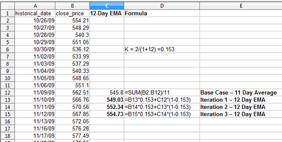 In our example we will calculate both the 12 day and 26 day EMA to provide a practical example. Since calculating the EMA requires the previous day's EMA value, we must setup a base case in order to generate the very first EMA value. This can be done simply by calculating a regular average of all the days prior to our first EMA calculation. If all of this is a lot to grasp, don't worry it is actually quite simple. Again, here is an example with a spreadsheet for the 12 day EMA: