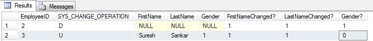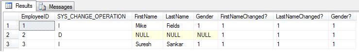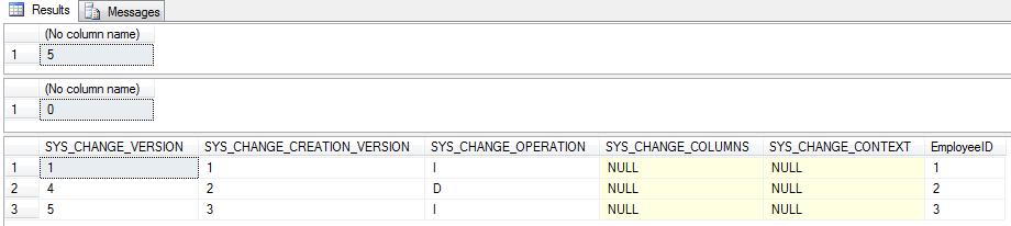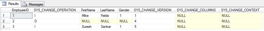 DECLARE @PreviousVersion bigint = 0 SELECT CTTable.EmployeeID, CTTable.SYS_CHANGE_OPERATION, Emp.FirstName, Emp.LastName, Emp.Gender, CTTable.SYS_CHANGE_VERSION, CTTable.SYS_CHANGE_COLUMNS, CTTable.SYS_CHANGE_CONTEXT FROM CHANGETABLE (CHANGES tblEmployee, @PreviousVersion) AS CTTable LEFT OUTER JOIN tblEmployee AS Emp ON emp.EmployeeID = CTTable.EmployeeID