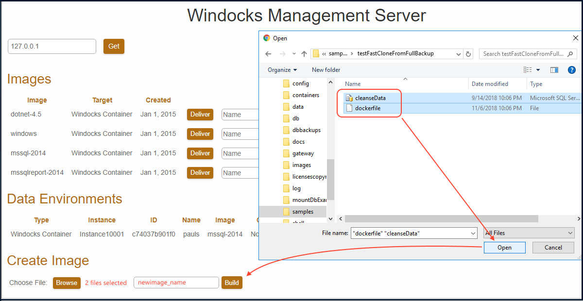 The image is built with a docker command: >docker build -t <imagename> c:\path\to\dockerfile. Alternatively, the dockerfile and scripts are selected and “built” using the Windocks web UI as shown below.