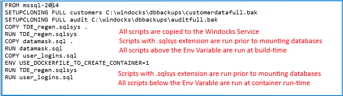 The dockerfile begins with a base image (FROM mssql-2014), followed by SETUPCLONING commands for the backups used to build the image. Scripts are copied to the image with COPY commands, and build-time and run-time scripts are determined by relative positioning to an environment variable ENV USE_DOCKERILE_TO_CREATE_CONTAINER=1. Scripts above the environment variable are RUN at build-time, and scripts listed below are RUN on each container as they are provisioned.