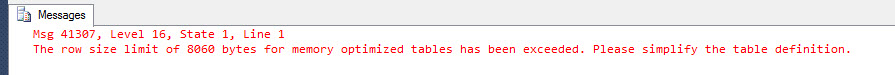 It’s acceptable for a table to have a total row size of variable length columns greater than 8K. In SQL Server 2014, this is still valid for disk-based tables, but memory-optimized table will not accept it. If we run
