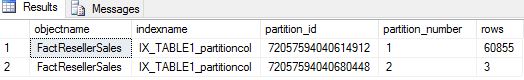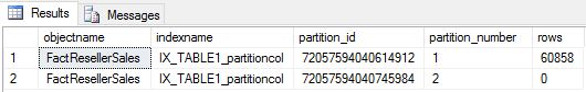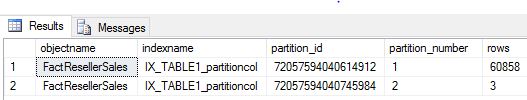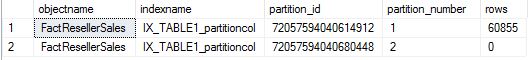 SELECT o.name objectname,i.name indexname, partition_id, partition_number, [rows] FROM sys.partitions p INNER JOIN sys.objects o ON o.object_id=p.object_id INNER JOIN sys.indexes i ON i.object_id=p.object_id and p.index_id=i.index_id WHERE o.name LIKE '%FactResellerSales%'