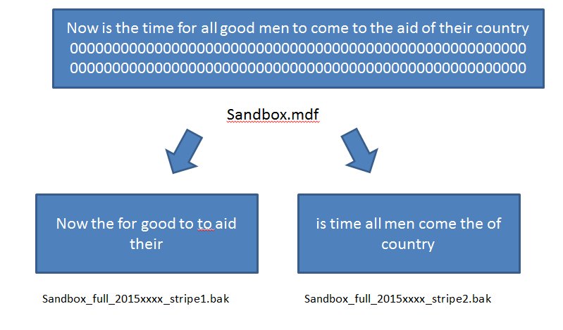 The striped backup works like this. Imagine that I have a database that contains data. I've simplifie the image below to show data as a sentence and 0s as empty space.