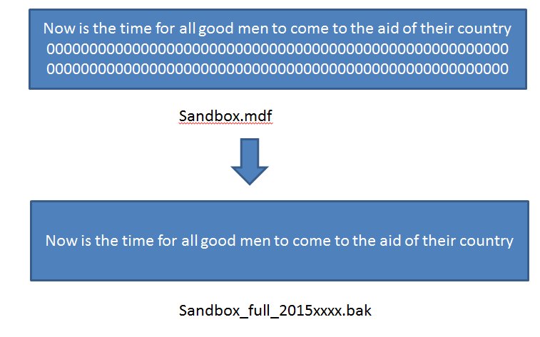 In reality, data is stored as pages, and those pages are what are copied to the backup file. There isn't necessarily an order or rhyme or reason to the order pages go into the backup file as it relates to data, so just understand that all data pages are copied to the backup file, but free space is not. This is shown below as the sentence copied to the backup file.