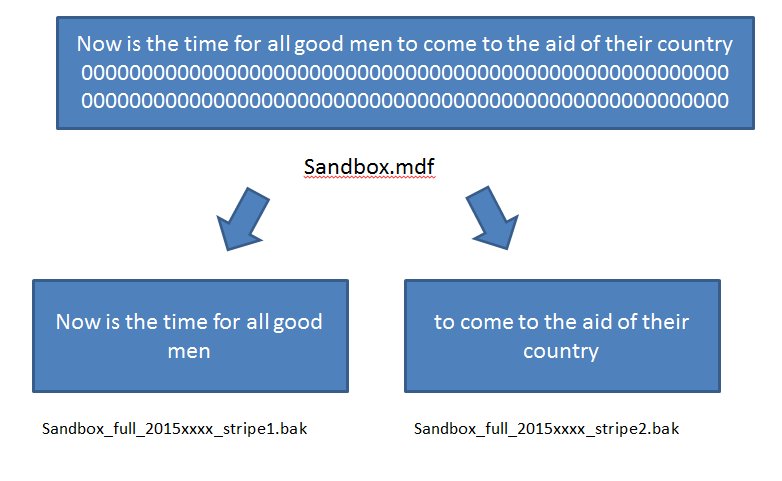 As you can see, some of my data is in one file and some is in the other. The critical understanding that you should take away from this is that to reverse this process with a restore, I need all of the stripes of my backup. There is no RAID here where data is duplicated and we can lose one of our stripes. We need them all to perform a restore.