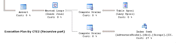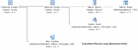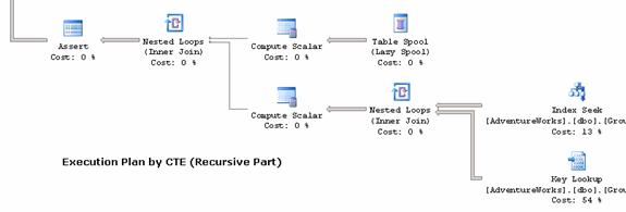 Run CTETestPopulateData2.txt to populate test data, and run the "Test4" in both CTETestByCTE.txt and CTETestByLoop.txt. The following is the new recursive part execution plan for CTE. Both plans for CTE and loop eliminated the key lookup operator.