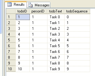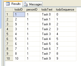 -- create the sequence test table create table dbo.ToDoList ( todoID int identity(1,1) not null primary key, PersonID int not null, todoText nvarchar(200) not null ) go -- populate the sequence test table insert into dbo.ToDoList(todoGroup, todoText) select 1, 'Task 0' union all select 1, 'Task 1' union all select 1, 'Task 2' union all select 1, 'Task 3' union all select 1, 'Task 4' union all select 1, 'Task 5' union all select 1, 'Task 6' union all select 1, 'Task 7' union all select 1, 'Task 8' union all select 1, 'Task 9' go