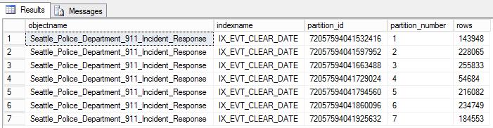 SELECT o.name objectname,i.name indexname, partition_id, partition_number, [rows] FROM sys.partitions p INNER JOIN sys.objects o ON o.object_id=p.object_id INNER JOIN sys.indexes i ON i.object_id=p.object_id and p.index_id=i.index_id WHERE o.name = 'Seattle_Police_Department_911_Incident_Response'