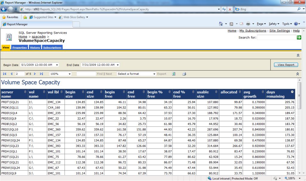 In order for database and volume space to be useful you should schedule a daily data collection process. A SQL Agent job creation script, spacedm.job.sql is included in the download section.