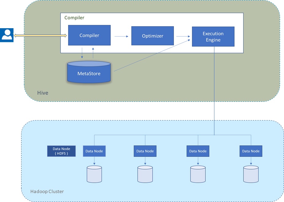 Within the driver, the compiler component generates an execution plan by parsing queries using table metadata and necessary read/write information from the Metastore. The plan is optimized and then passed to the engine to execute the initial required steps and then sends MapReduce to Hadoop. The execution engine delivers results ( received from Hadoop and/or prepared locally) to the client. Unlike Polybase Hive relies on the heavily on the Hadoop cluster and automatically pushes MapReduce computations to it. More on Hive can be found here SQL-On-Hadoop : Hive-Part 1.