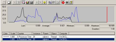 In Test 1, we set the first query to execute with @iNBR_DOEVENTS = 1000 and the second query with 0. Perfmon shows that the first query (in blue) yields most of its CPU cycle to query two (in black) as long as query two is running. Query two executes the loops faster than query 1, which was our goal.