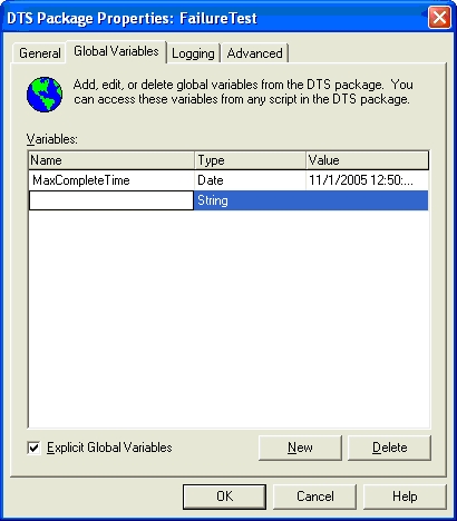 The ActiveX Scripting part of DTS allows you to use variables to make decisions. When you click on the Package menu of the DTS, and then Properties, the Global Variables tab opens up (Figure 1) a wide range of possibilities. In this case, I use it to hold the test value to determine if my processing can continue.