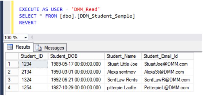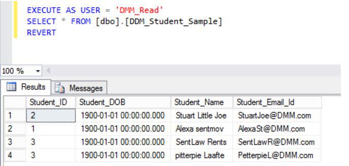 As we have applied Default DDM function on column Student_DOB, so lets check how the data will appear when user having read permission on a table using below script.