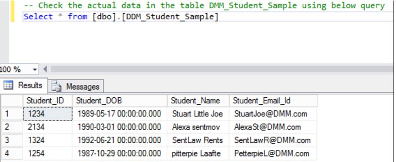 -- Check the actual data in the table DDM_Student_Sample using the below query Select * from [dbo].[DDM_Student_Sample]