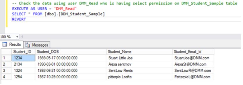 -- Check the data using user DDM_Read who is having select permission on DDM_Student_Sample table EXECUTE AS USER = 'DDM_Read' SELECT * FROM [dbo].[DDM_Student_Sample] REVERT