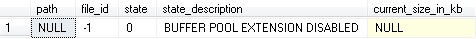 This new view provides configuration information about the new buffer pool extension functionality in SQL Server 2014. It will return one row per buffer pool extension file. If this feature is disabled, a single row will be returned with default metadata that will look like this: