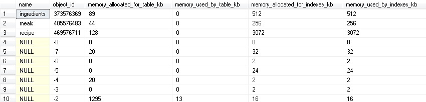 ON all_objects.object_id = dm_db_xtp_table_memory_stats.object_idThe output of this query will look like this: