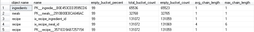Our example above is far too small to be able to analyze with any intention to optimize it, but it illustrates the layout of this DMV and how the data will look when returned. Hash indexes are extremely efficient for equality searches and scans and this new view will allow you to make the best decisions with regards to their creation, usage, and maintenance.