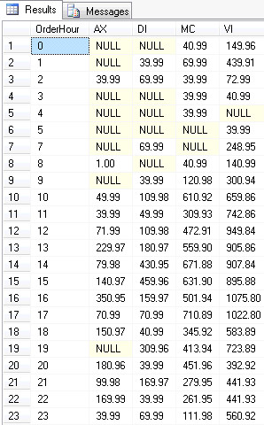 @selectCols nvarchar(4000) - A comma delimited list of columns that you will want to select from. This must include the aggregate field as well as the @pivotColumn. I would also suggest another field for the row analytics ie PayMethod, OrderHour, ProductTotal where PayMethod or OrderHour could be my pivotColumn and ProductTotal will be my aggregate.