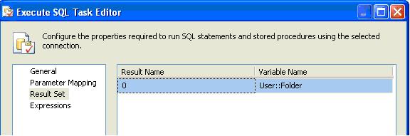 In the Result Set Tab, store the results in a new string variable named "Folder" and change the Result Name to 0.