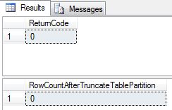 DECLARE @ReturnCode int EXECUTE @ReturnCode = [TEST].[dbo].[usp_Util_TruncatePartition] @tableName='TestTruncatePartition' ,@partitionValue=200 ,@schemaName='dbo' SELECT @ReturnCode AS ReturnCode GO SELECT COUNT(*) AS [RowCountAfterTruncateTablePartition] FROM TestTruncatePartition WHERE [PartitionParameter]>100 AND [PartitionParameter]<=200 GO