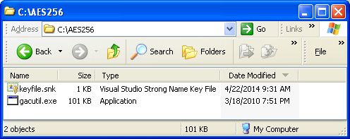 Open a command console window, create a directory named "C:\AES256," move to the "C:\AES256" directory, then create a strong name key file with the command "sn -k keyfile.snk."