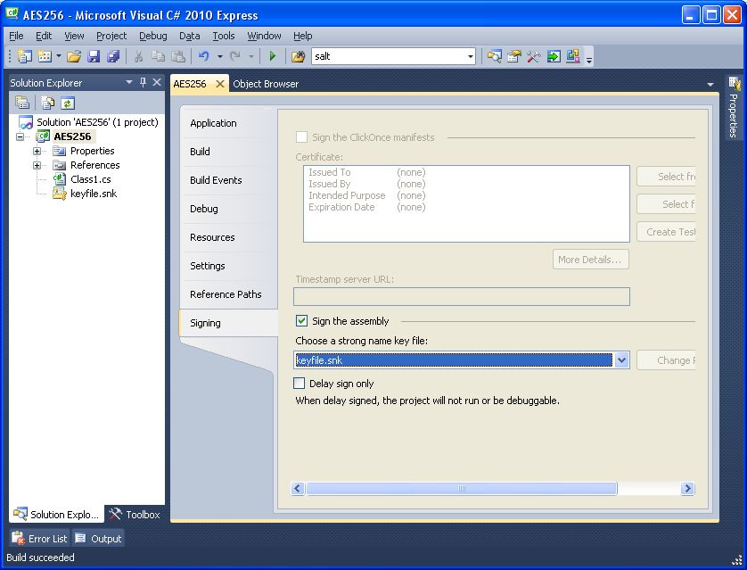 Click on the "Signing" tab of the properties configuration panel, then browse to the "C:\AES256" folder and select the "keyfile.snk" key file.